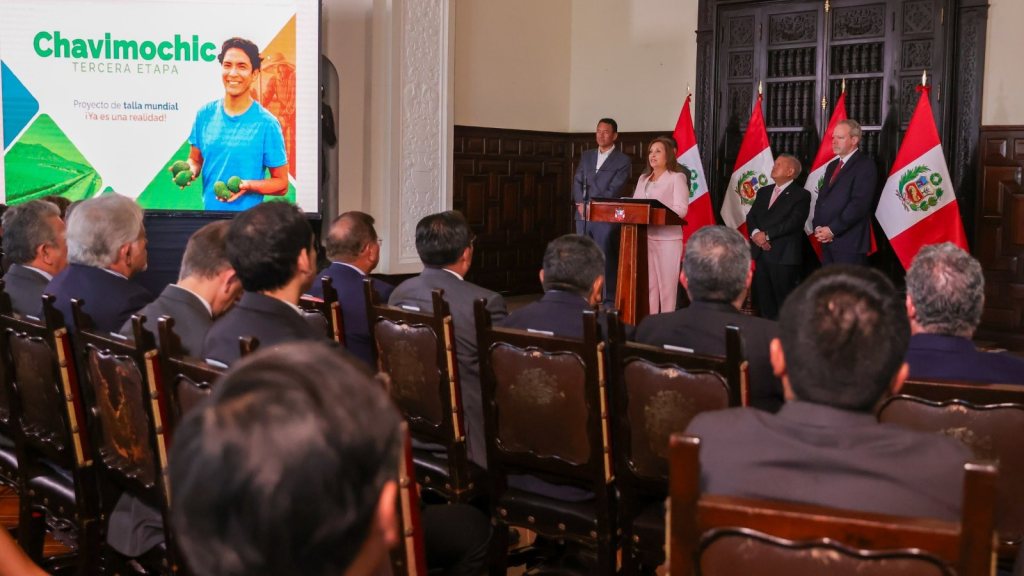 Luego de liderar la sesión del Consejo de Ministros, la presidenta Dina Boluarte se trasladó a la ceremonia de suscripción del contrato de Estado a Estado para el servicio de asistencia técnica del Proyecto Chavimochic Tercera Etapa. Este evento, programado para las 12:30 horas en el Palacio de Gobierno.