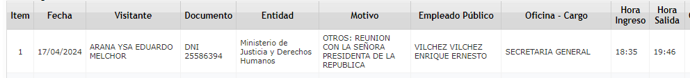 Más tarde, a las 6:35 p. m., la presidenta se reunió con Eduardo Arana, ministro de Justicia y Derechos Humanos. La sesión finalizó a las 7:46 p. m.