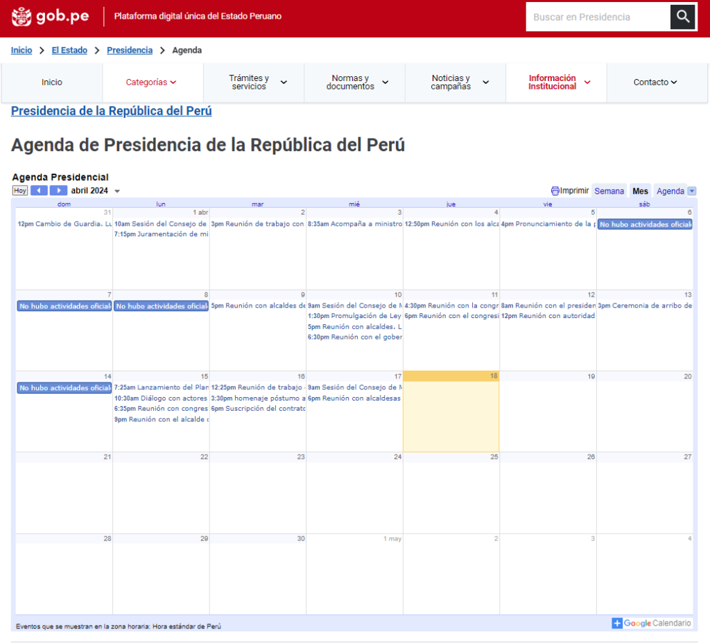 Durante la tarde del miércoles 17 y jueves 18 de abril, la presidenta de la República, Dina Boluarte, no tuvo actividades oficiales. Sin embargo, a través de Transparencia y la cuenta oficial de la Presidencia de la República en X, antes Twitter, se difundieron datos relevantes sobre visitas y propuestas políticas.