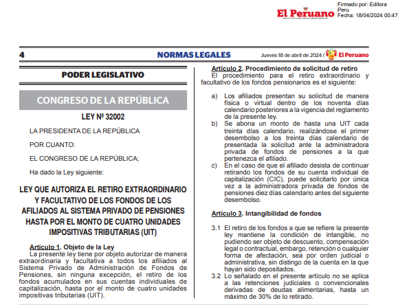 No obstante, se dio a conocer que el Gobierno de Boluarte promulgó la Ley 32002, que autoriza el retiro de hasta cuatro unidades impositivas tributarias (UIT) de los fondos de pensiones de las administradoras de fondos de pensiones (AFP). El documento cuenta con la firma de la presidenta y el titular de la Presidencia del Consejo de Ministros (PCM), Gustavo Adrianzén.