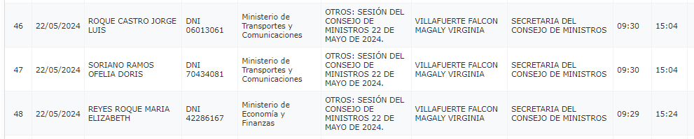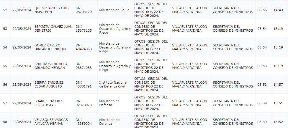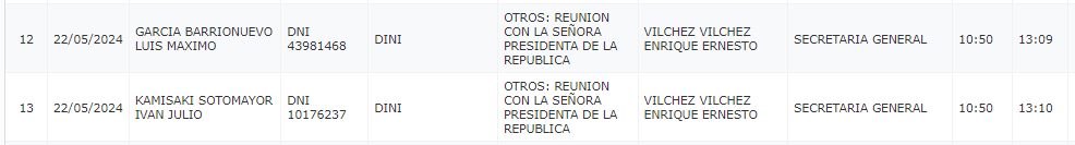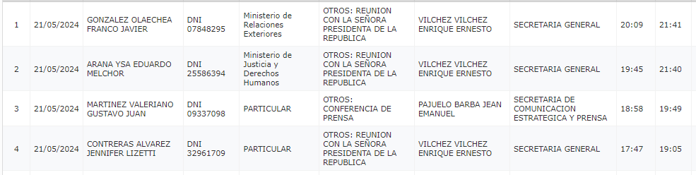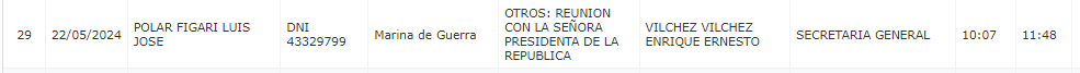 Por otro lado, según el registro de visitas de despacho presidencial, la presidenta sostuvo reunión con Luis Polar Figari, General de la Marina de Guerra; Luis Máximo García, director de Inteligencia Nacional de la Dirección Nacional de Inteligencia; e Iván Julio Kamisaki, también funcionario de la DINI. La reunión fue registrada desde las 10 de la mañana hasta la 1 de la tarde de este miércoles 22 de mayo.