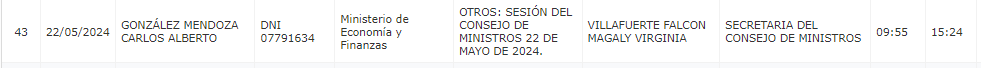 La jornada de la presidenta Dina Boluarte inició con la sesión de consejo de ministros a las 9:00 en Palacio de Gobierno. En el portal transparencia se registraron la asistencia de Luis Quiroz, funcionario del ministerio de Salud; Juan Demetrio Espíritu e Hirlando Gómez del Ministerio de Desarrollo Agrario y Riego; César Sierra, director de la Dirección de Respuesta del Instituto Nacional de Defensa Civil; Percy Suárez y Amílcar Velásquez, funcionarios del ministerio de Defensa.