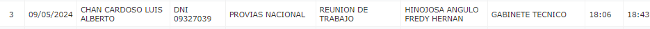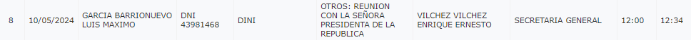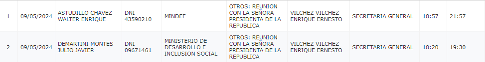 Además, de acuerdo al portal transparencia de Presidencia de la República se registró la visita de Luis Maximo Garcia Barrionuevo, director de Inteligencia Nacional a las 12 del mediodía, cuya reunión culminó a las 12:34.
