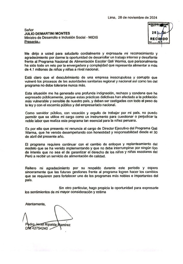 A través de su cuenta personal de X (antes Twitter), el funcionario publicó la misiva dirigida al ministro Julio Demartini para comunicarle su dimisión. “Como servidor público, con vocación y orgullo de trabajar por mi país, no puedo permitir que se utilice mi cargo como un instrumento para cuestionar o perjudicar la noble labor que realiza este programa tan esencial para la niñez peruana”, se lee en el documento.