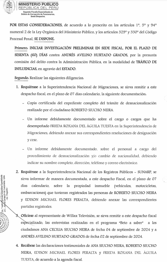A continuación podrás ver el documento emitido por la Segunda Fiscalía Especializada en Delitos de Lavado de Activos solicitando el testimonio de Edison Flores y el registro de todos sus bienes: