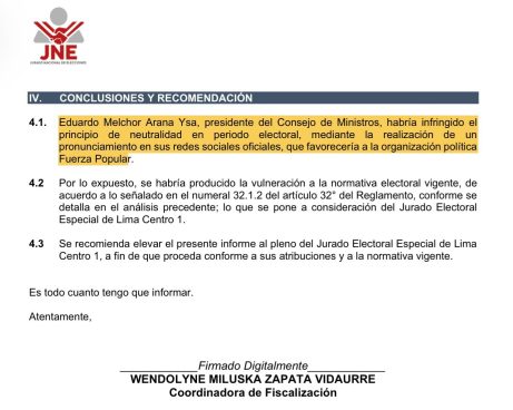 La coordinadora del área de Fiscalización del Jurado Electoral Especial (JEE) emitió un informe en el que concluyó que el premier, Eduardo Arana, habría infringido el principio de neutralidad electoral por una publicación desde la Presidencia del Consejo de Ministros (PCM).