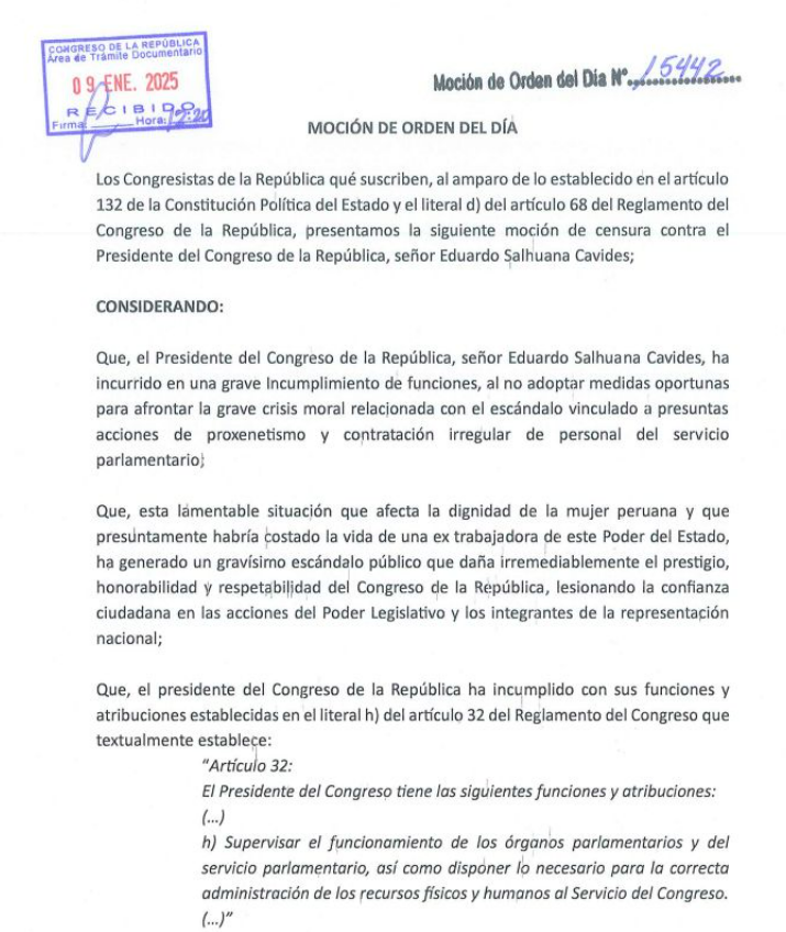 La bancada Honor y Democracia presentó la moción de censura contra el presidente del Congreso, Eduardo Salhuana, tras su viaje a China y por la presunta red de prostitución que habría operado dentro del Congreso y que involucraría al partido político APP, bancada a la cual pertenece Salhuana.