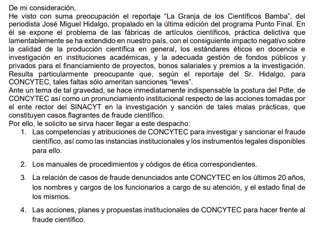 Por otra parte, el congresista solicitó a Benjamín Marticorena, presidente de Concytec, que haga llegar a su despacho la siguiente información: Competencias y atribuciones de Concytec para investigar y sancionar el fraude científico, así como las instancias institucionales y los instrumentos legales disponibles para ello, los manuales de procedimientos y códigos de ética correspondientes, la relación de casos de fraude denunciados ante Concytec en los últimos 20 años, así como las acciones, planes y propuestas institucionales de la entidad para hacer frente al fraude científico.