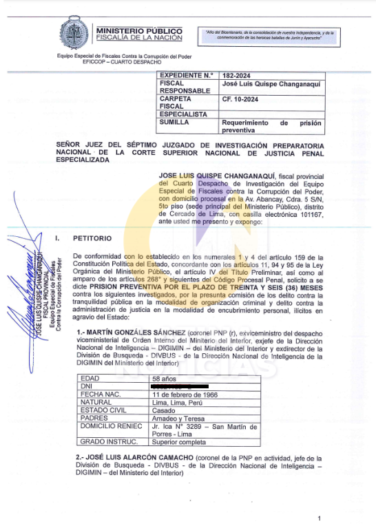 Además de Martín Gonzáles Sánchez, el Ministerio Público ordenó también las detenciones y prisión preventiva por 36 meses al coronel PNP José Luis Alarcón Camacho, jefe de la División de Búsqueda – DIVBUS – de la Dirección nacional de Inteligencia – DIGIMIN – del Ministerio del Interior.