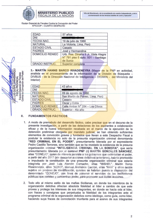 El Equipo Especial de Fiscales Contra la Corrupción del Poder (Eficcop) solicitó 36 meses de prisión preventiva contra el coronel PNP (r) Martín Gonzales, conocido como “Conejo”, el Coronel PNP José Luis Alarcón Camacho y el Mayor PNP Martín Hanns Barco.