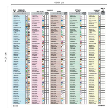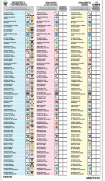 La cédula principal servirá para la elección de presidente y vicepresidentes, senadores, diputados y representantes al Parlamento Andino. Estará dividida en cinco columnas de distintos colores que permitirán identificar a las organizaciones políticas. Cada columna incluirá el símbolo del partido, los nombres de los candidatos y, en el caso de la fórmula presidencial, sus fotografías.