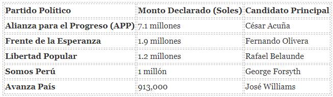 Alianza para el Progreso (APP) lidera el ranking con la campaña más costosa. Llama la atención que casi 4 millones de soles provienen del círculo íntimo de César Acuña, principalmente bajo la modalidad de aportes en especie (pago de publicidad y materiales):