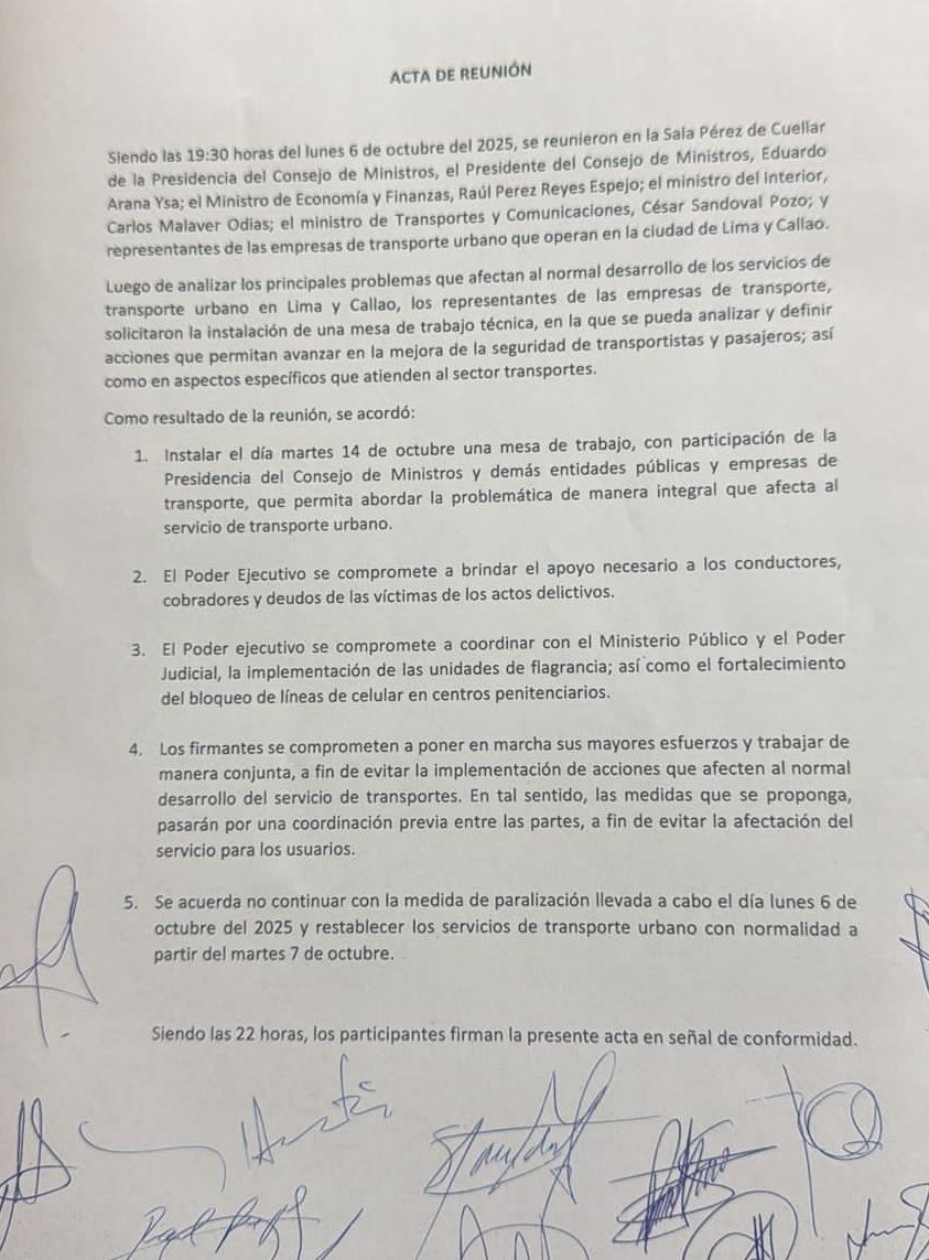 “Se acuerda no continuar con la medida de paralización llevada a cabo el lunes 6 de octubre del 2025 y restablecer los servicios de transporte urbano con normalidad a partir del martes 7 de octubre”, mencionó Martín Ojeda en conferencia de prensa, que terminó en apretones de mano con los ministros presentes.