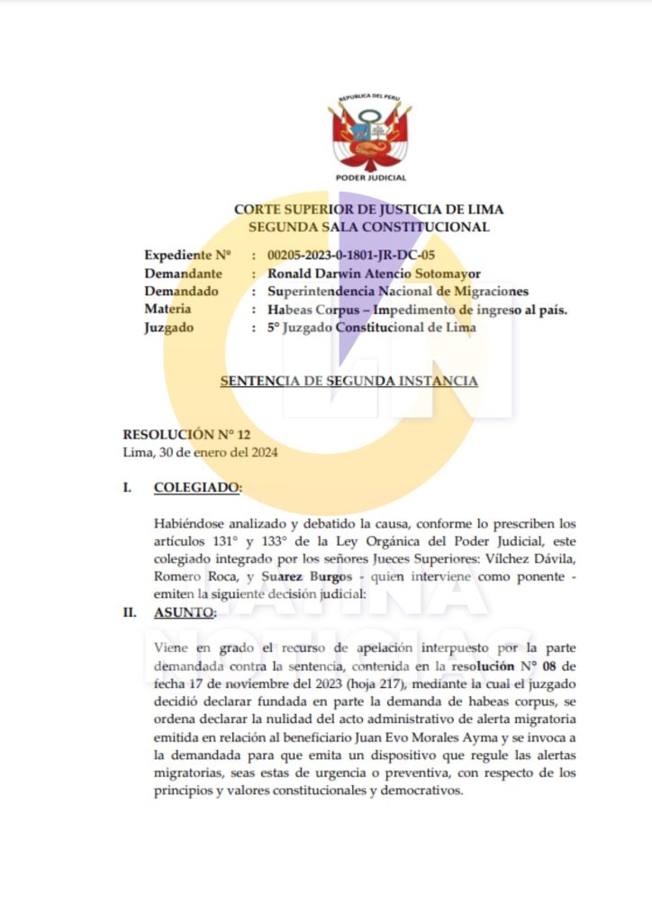 El pasado 30 de enero, el Poder Judicial declaró improcedente en segunda instancia el habeas corpus que presentó un abogado para dejar sin efecto la decisión de la Superintendencia Nacional de Migraciones de impedir el ingreso del expresidente boliviano Evo Morales, dictada en enero del 2023. Latina Noticias accedió al documento que explica con detalle cuáles fueron los argumentos en los que se sustentó la entidad para mantener su postura con respecto al expresidente de Bolivia.