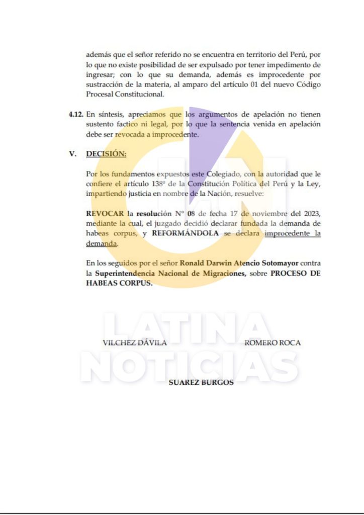 Posteriormente, el 17 de noviembre del 2023 el Quinto Juzgado Constitucional de Lima declaró fundado en parte el hábeas corpus debido a que si bien Migraciones tiene la facultad de emitir este impedimento, este debe estar bien fundamentado para que no choque con el derecho al libre tránsito. No obstante, el 30 de enero se decidió revocar la demanda y “reformándola” se la declaró improcedente.