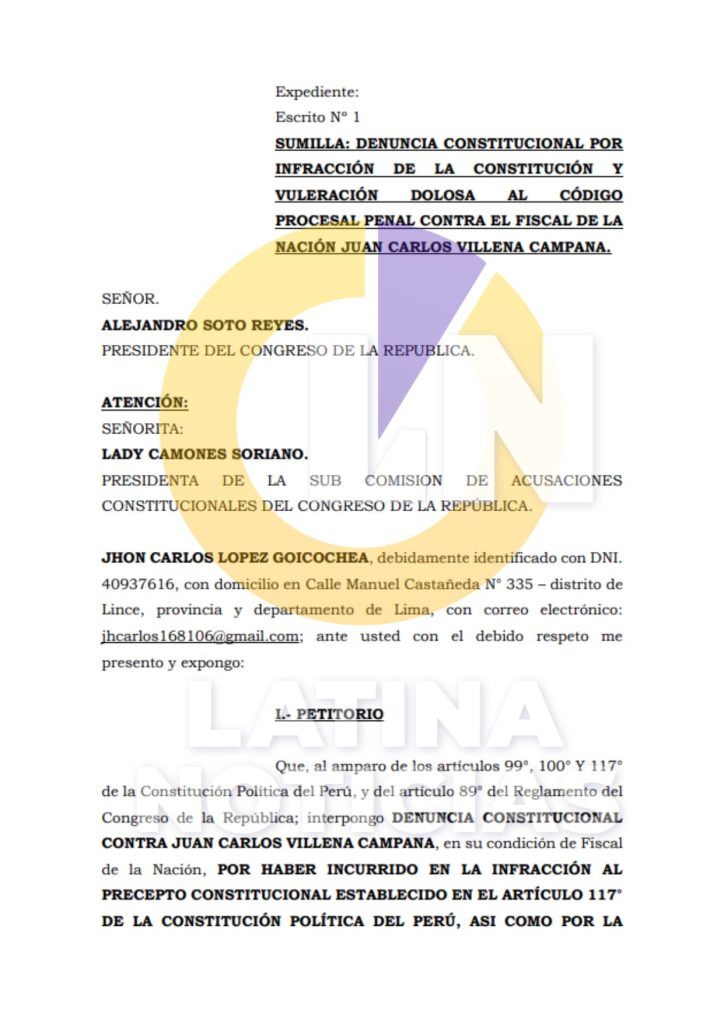 “Al amparo de los artículos 99, 100 y 117 de la Constitución política del Perú, y del artículo 89 del reglamento del Congreso de la República; interpongo denuncia constitucional contra Juan Carlos Villena, en su condición de fiscal de la nación, por haber incurrido en la infracción al precepto constitucional establecido en el artículo 117° de la Constitución Política del Perú, así como por la presunta comisión del delito contra la administración de justicia en la modalidad de prevaricato establecido en el artículo 418° del código penal“, señala el demandante en el petitorio.