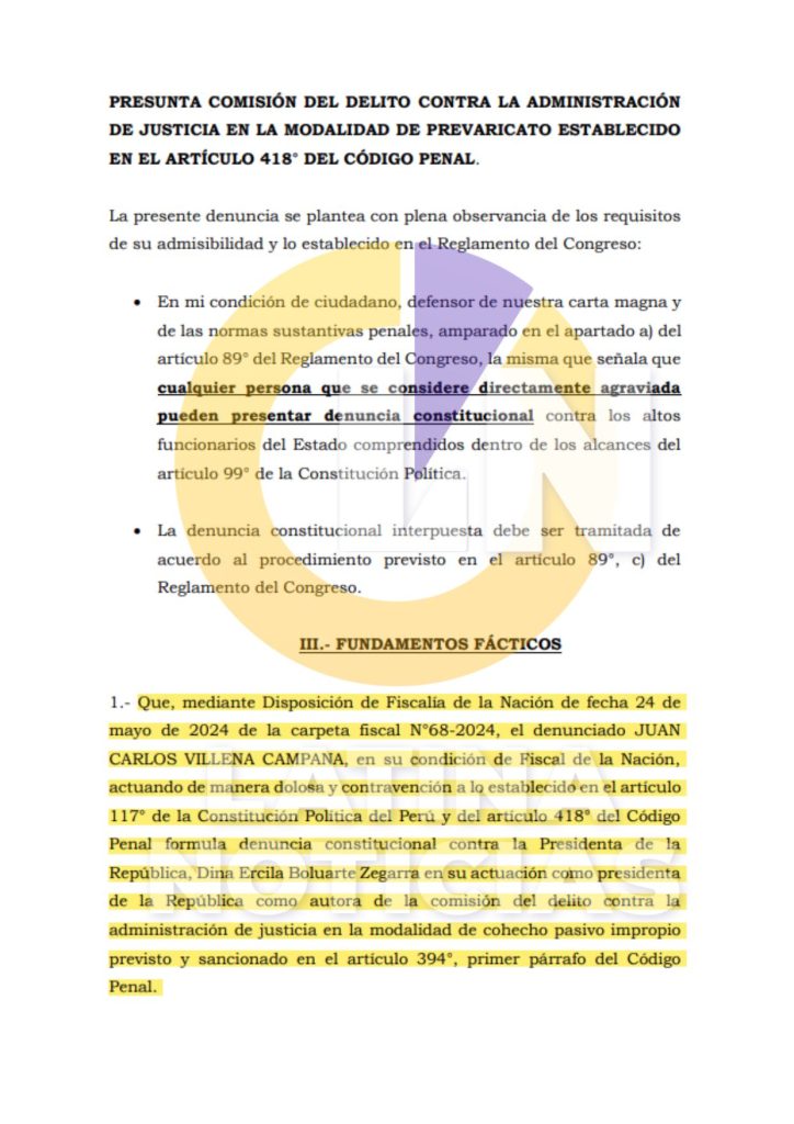 “Que, mediante disposición de Fiscalía de la Nación de fecha 24 de mayo de 2024 de la carpeta fiscal N°68-2024, el denunciado Juan Carlos Villena Campana, en su condición de Fiscal de la Nación, actuando de manera dolosa y contravención a lo establecido en el artículo 117° de la Constitución Política del Perú y del artículo 418° del Código Penal formula denuncia constitucional contra la Presidenta de la República, Dina Ercila Boluarte Zegarra en su actuación como presidenta de la República como autora de la comisión del delito contra la administración de justicia en la modalidad de cohecho pasivo impropio previsto y sancionado en el artículo 394°, primer párrafo del Código Penal“, indica el ciudadano López.