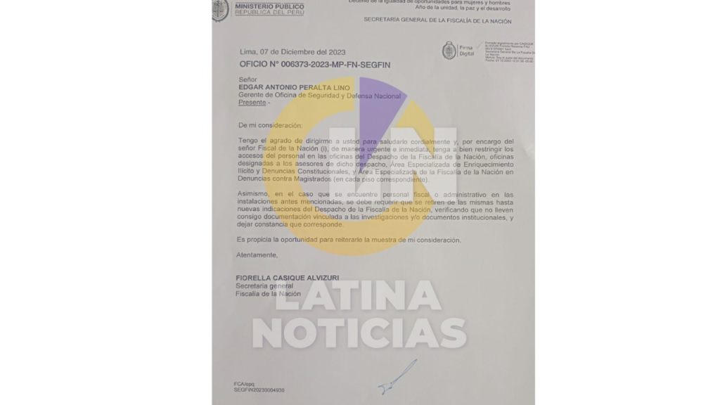 A través de un oficio elaborado por la secretaria general de la Fiscalía de la Nación, Fiorella Casique, enviado a Edgar Peralta Lino, gerente de la Oficina de Seguridad y Defensa Nacional del Ministerio Público, se ordena que se restrinja el acceso del personal a las oficinas del Despacho de la Fiscalía de la Nación, de los asesores de dicho despacho, del Área Especializada de Enriquecimiento Ilícito y Denuncias Constitucionales, y del Área Especializada de la Fiscalía de la Nación en Denuncias contra Magistrados.