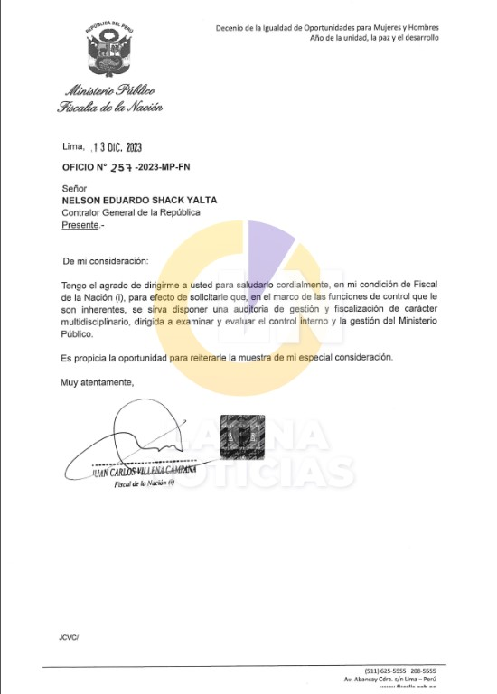 El Fiscal de la Nación interino, Juan Carlos Villena, solicitó al contralor de la República, Nelson Shack, una auditoría de gestión y fiscalización de carácter multidisciplinario, dirigida a examinar y evaluar el control interno y la gestión del Ministerio Público, esto tras la suspensión de la exfiscal de la Nación, Patricia Benavides.