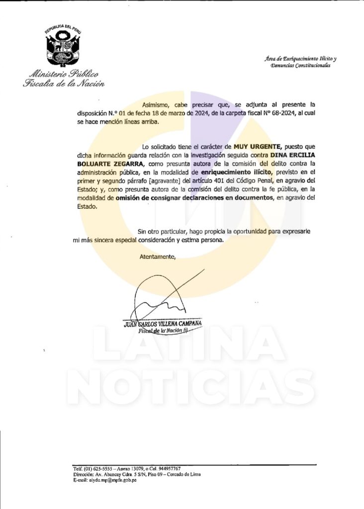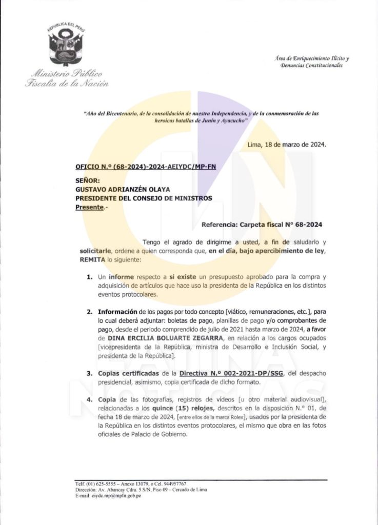 El Fiscal de la Nación, Juan Carlos Villena, solicitó al presidente del Consejo de Ministros, Gustavo Adrianzén, las boletas y comprobantes de pago a favor de la presidenta Dina Boluarte correspondientes al período de julio de 2021 a marzo de 2024.