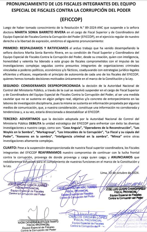 Los fiscales del Eficcop también calificaron de “desproporcionada” la decisión de la Autoridad Nacional de Control del Ministerio Público de suspender por 6 meses a Marita Barreto y que, por el contrario, debilita el accionar de ese equipo.