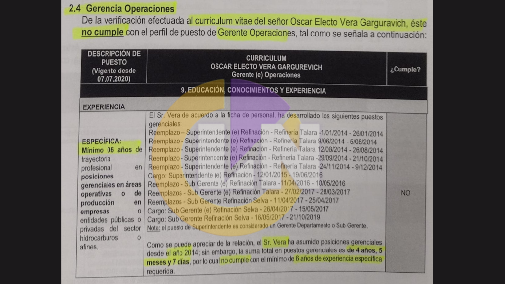 Contraloría señaló que existen indicios de irregularidades en la designación de Óscar Vera como gerente de operaciones en Petroperú y recomendó informar al presidente del directorio de la empresa estatal para que tome las acciones correspondientes ante la designación de profesionales que no cumplen con los requisitos establecidos.