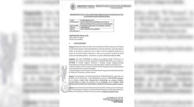“No procede formalizar no continuar con la investigación preparatoria por la presunta comisión del delito contra la tranquilidad pública en la modalidad de terrorismo“, se aprecia en el documento emitido.