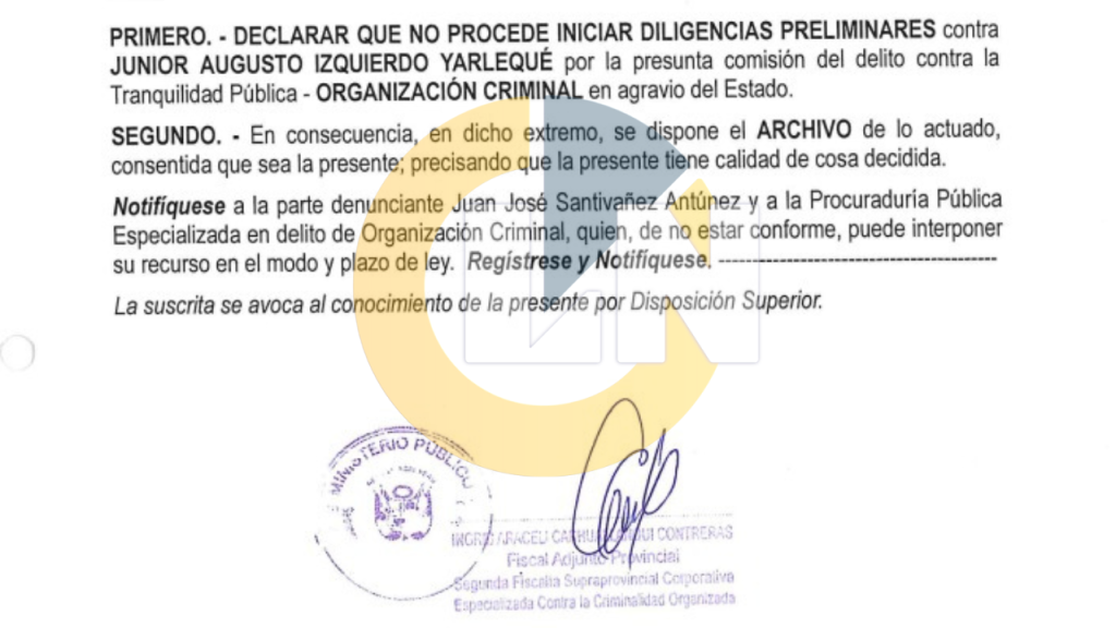 “Dispone declarar que no procede iniciar diligencias preliminares contra Junior Augusto Izquiero Yarlequé por la presunta comisión de delito contra la tranquilidad pública – Organización criminal en agravio del Estado”, se lee en el documento difundido por la Fiscalía.