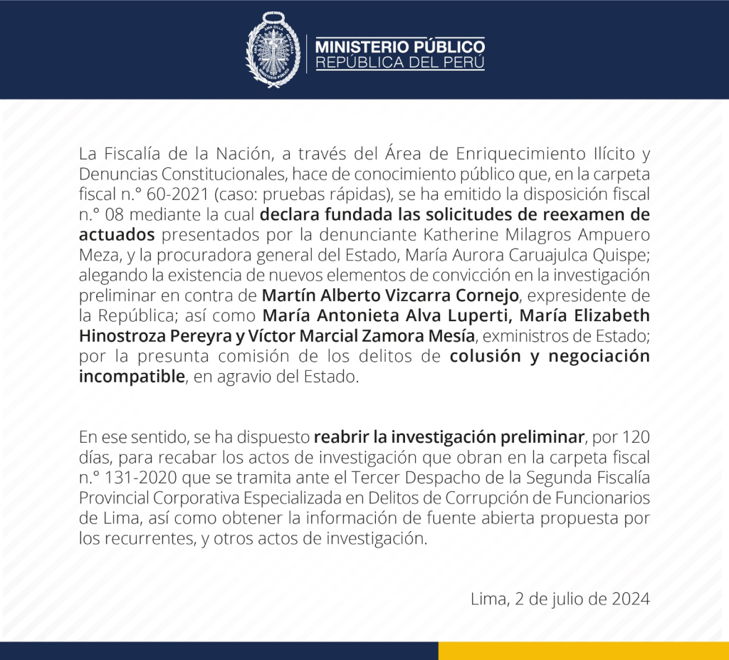 La Fiscalía de la Nación informó que reabrió la investigación por el caso ‘pruebas rápidas’ contra el expresidente Martín Vizcarra, los exministros María Alva (Economía), Elizabeth Hinostroza y Víctor Zamora (Salud) por haber cometido los presuntos delitos de colusión y negociación incompatible en agravio del Estado.