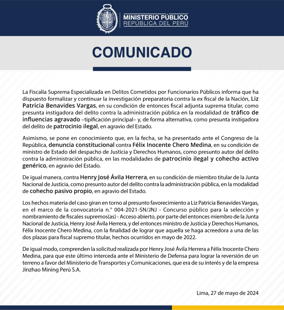 Según el comunicado, Benavides es señalada de cometer estos ilícitos porque habría actuado como ‘instigadora’ para que sea beneficiada para lograr una plaza en la Junta de Fiscales Supremos en mayo del 2022. Y en esto habría contado con el apoyo de José Ávila, exmiembro de la Junta Nacional de Justicia (JNJ), y el exministro de Justicia del gobierno de Pedro Castillo, Félix Chero.