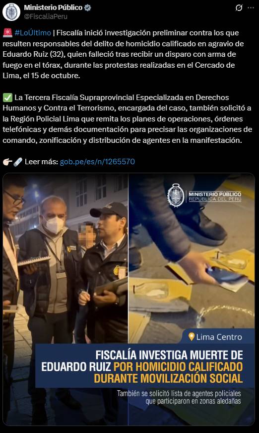 La Tercera Fiscalía Supraprovincial Especializada en Derechos Humanos y Contra el Terrorismo, que dirige el fiscal provincial Roger Yana Yanqui, inició investigación preliminar contra los que resulten responsables por el delito de homicidio calificado en agravio de Eduardo Ruiz, de 32 años de edad, quien falleció tras recibir un disparo con arma de fuego en el tórax durante las protestas realizadas en el Centro de Lima, ayer miércoles 15 de octubre.