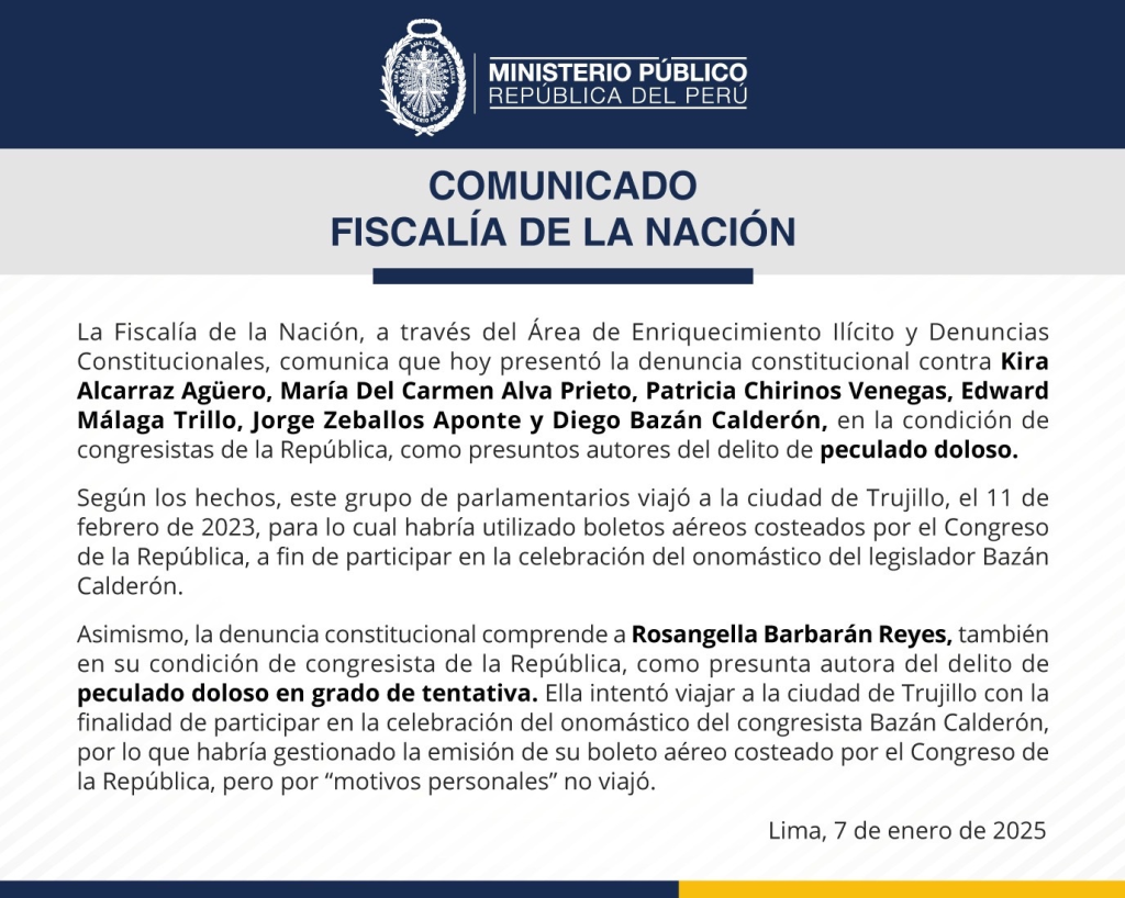 El Ministerio Público informó que presentó una denuncia constitucional contra un grupo de congresistas de la República que habrían usado recursos públicos para viajar a la ciudad de Trujillo y ser partícipes del cumpleaños del legislador Diego Bazán (Renovación Popular) el 11 de febrero del 2023.