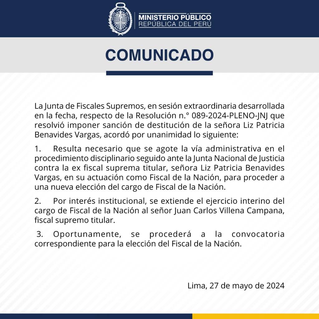 El comunicado enfatiza que se extiende el cargo interino de Juan Carlos Villena en el Ministerio Público y que se procederá a la convocatoria de este cargo en otro momento de manera pertinente.