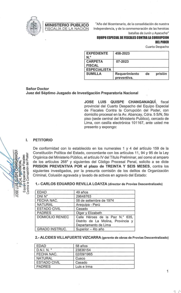 José Quispe Changanaqui, fiscal miembro del Equipo Especial de Fiscales contra la Corrupción del Poder, ha solicitado esta medida por los presuntos delitos de organización criminal, colusión agravada y lavado de activos en agravio del Estado.