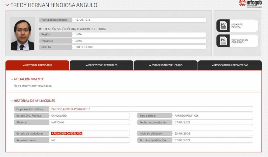 No obstante, Hinojosa tampoco estuvo desligado de algunas polémicas. Y es que militó en el Partido Aprista Peruano entre el 23 de enero del 2008 al 7 de septiembre del 2021.