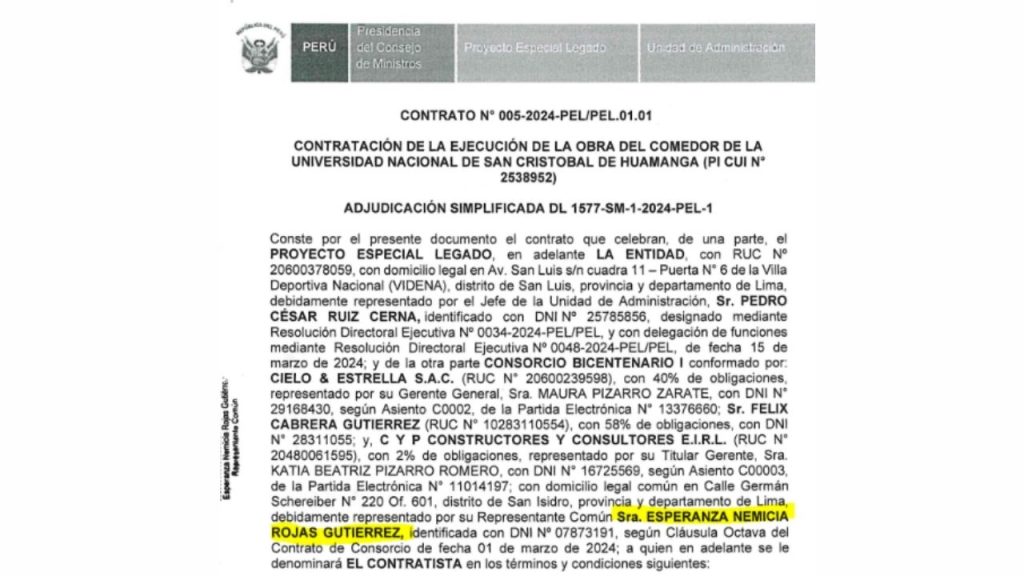 Latina Noticias accedió al contrato firmado entre Legado y el postor ganador. El documento lleva la rúbrica de la empresaria Esperanza Nemicia Rojas Gutiérrez, como representante legal del consorcio. Se trata nada más, y nada menos, que de la presidenta del movimiento político regional Rumi Llaqta, el partido por el que Wilfredo Oscorima se convirtió en gobernador regional en las elecciones del 2022.