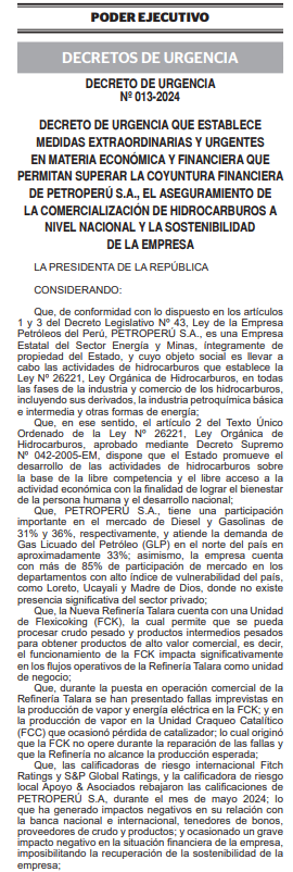A través del Decreto de Urgencia Nº 010-2022, aparecida hoy en el diario oficial El Peruano, dispone ampliar hasta el 31 de julio de 2025 el plazo de la operación de endeudamiento de corto plazo de la petrolera estatal a la línea de crédito de comercio exterior con el Banco de la Nación, hasta por la suma de mil millones de dólares.