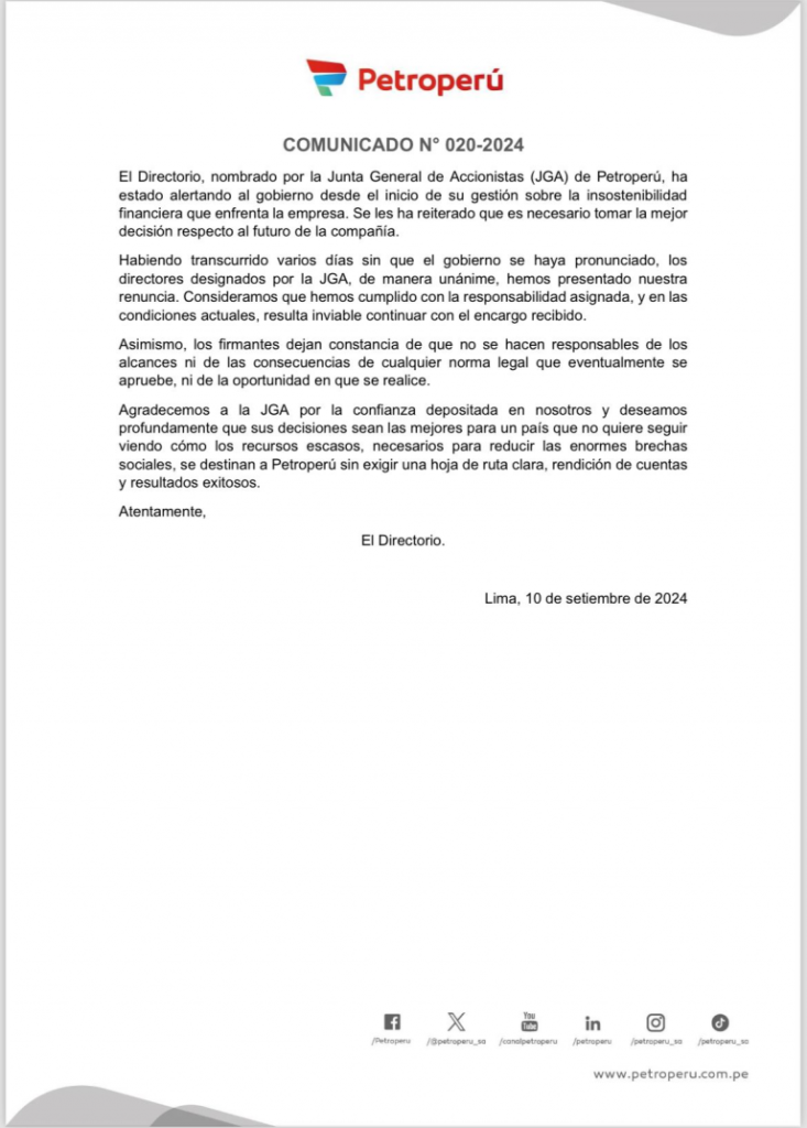 «Habiendo transcurrido varios días sin que el gobierno se haya pronunciado, los directores consignados por la JGA, de manera unánime hemos presentado nuestra renuncia», se lee en el comunicado difundido por redes sociales.