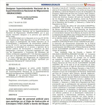 En paralelo, mediante la Resolución Suprema N.° 084-2026-IN, el Ejecutivo aceptó la renuncia de Manuel Alberto Balladares Ramírez, quien se desempeñaba como titular de Migraciones desde 2025. En el documento se le agradece por los servicios prestados.