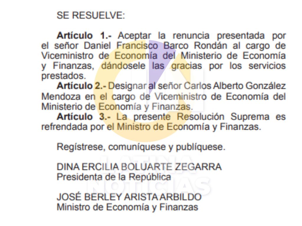 A través de la Resolución Suprema N° 018-2024-EF se formalizó dicha decisión, la cual fue publicada en el diario oficial El Peruano. En este documento, se acepta la renuncia de Daniel Barco Rondán y se designa a Carlos Alberto González Mendoza.