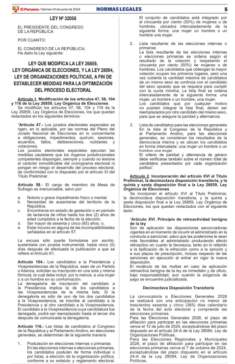 Entre los principales cambios que se observa es que se modifica los plazos para que alguna persona que desee postular en las elecciones generales, municipales y regionales del 2026 se pueda afiliar a un partido. Ahora, para intentar ser presidente, vicepresidente o parlamentario, el candidato o la candidata tiene hasta el 12 de julio de este año. En tanto, para ser gobernador o alcalde se contará con una prórroga hasta el próximo 7 de octubre.