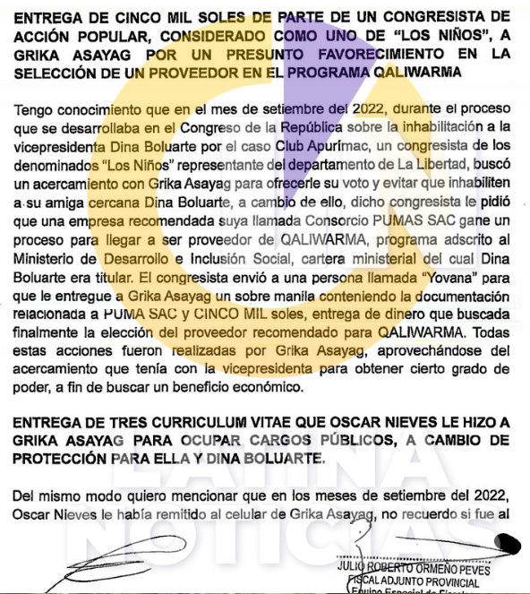 “Un congresista de los denominados ‘Los Niños’ representante del departamento de La Libertad, buscó un acercamiento con Grika Asayag para ofrecerle su voto y evitar que inhabiliten a su amiga cercana Dina Boluarte”, se lee en la declaración. En esa línea, este representante de AP habría intercedido con la excolaboradora de Boluarte para favorecer a la empresa Puma SAC.