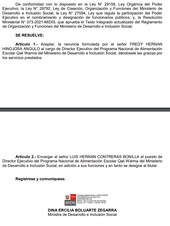 Un detalle que llama la atención es que este aparente acto de corrupción habría sucedido cuando Fredy Hinojosa, actual vocero de la Presidencia de la República, estaba al mando de Qali Warma como director ejecutivo. Precisamente, Hinojosa presentó su carta de renuncia a este programa del MIDIS en noviembre del 2022.
