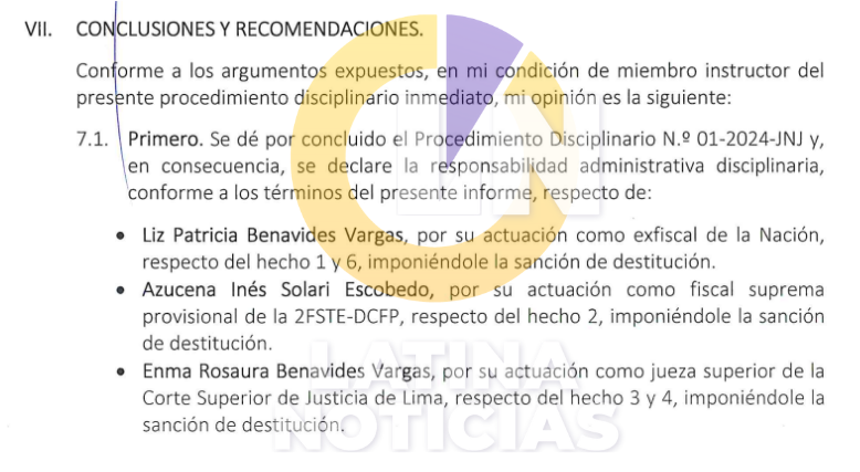 Latina Noticias accedió al documento elaborado por Tello, quien determinó que Benavides interfirió en la investigación contra su hermana, la jueza Emma Benavides, que es señalada de presuntamente recibir dinero de narcotraficantes colombianos a cambio de disponer de sus liberaciones. Esto lo hizo al disponer del cambio de Bersabeth Revilla, la fiscal que estaba a cargo de la indagación, por Azucena Solari Escobedo.