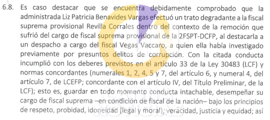“Se encuentra debidamente comprobado que la administrada Liz Patricia Benavides Vargas efectuó un trato degradante a la fiscal suprema provisional Revilla Corrales dentro del contexto de la remoción que sufrió del cargo de fiscal suprema provisional”, se lee en el informe.