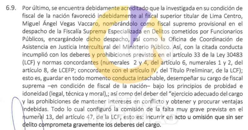 Además, el reporte de la magistrada de la JNJ, Inés Tello, concluyó que Patricia Benavides favoreció a Miguel Vegas Vaccaro para que sea nombrado fiscal supremo provisional en la Fiscalía Suprema Especializada en Delitos cometidos por Funcionarios Públicos.
