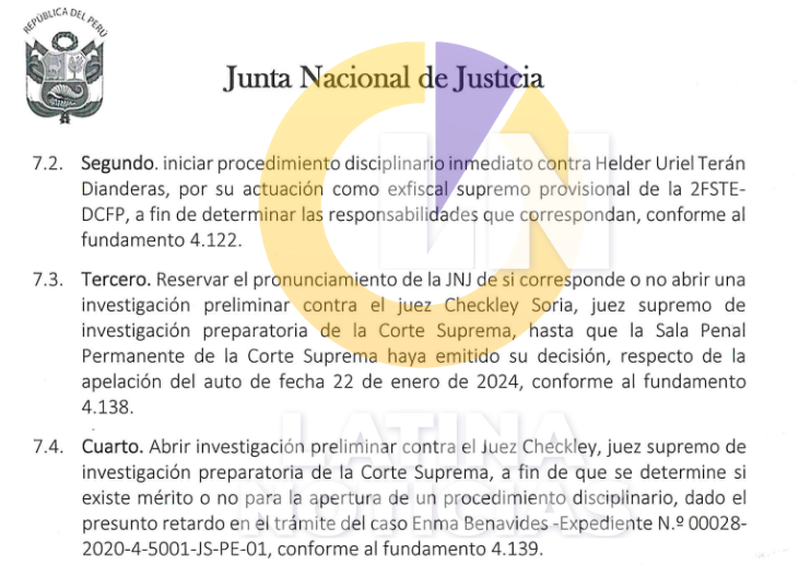 Adicionalmente, el informe Tello dispone que se le inicie una investigación preliminar contra el exfiscal supremo Helder Uriel Terán y el juez supremo Juan Carlos Checkley Soria por el caso de Enma Benavides.