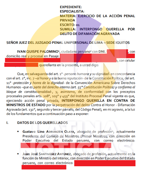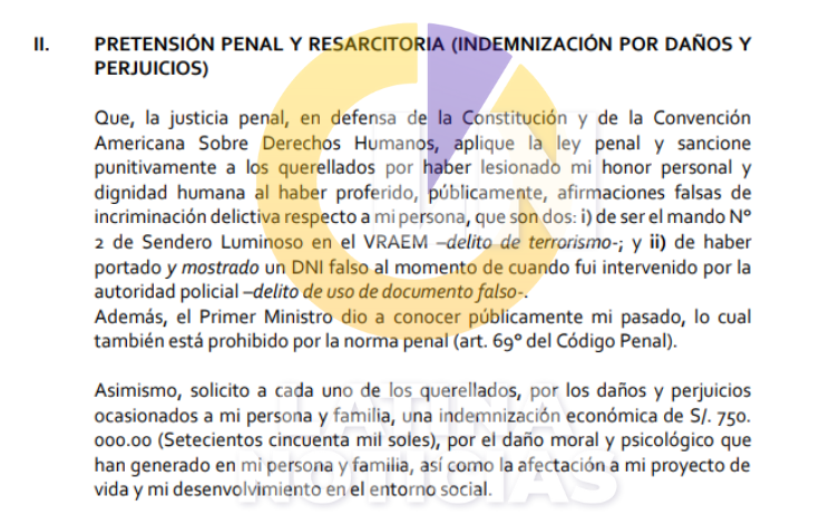 En el escrito al que Latina Noticias tuvo acceso, Quispe Palomino acusa a Adrianzén y Santiváñez de haber cometido el presunto delito contra el honor, en la modalidad de difamación agravada, al exponerlo como un alto dirigente terrorista. Además, a los dos funcionarios le exige una reparación de 750 mil soles por daños y perjuicios a su imagen.