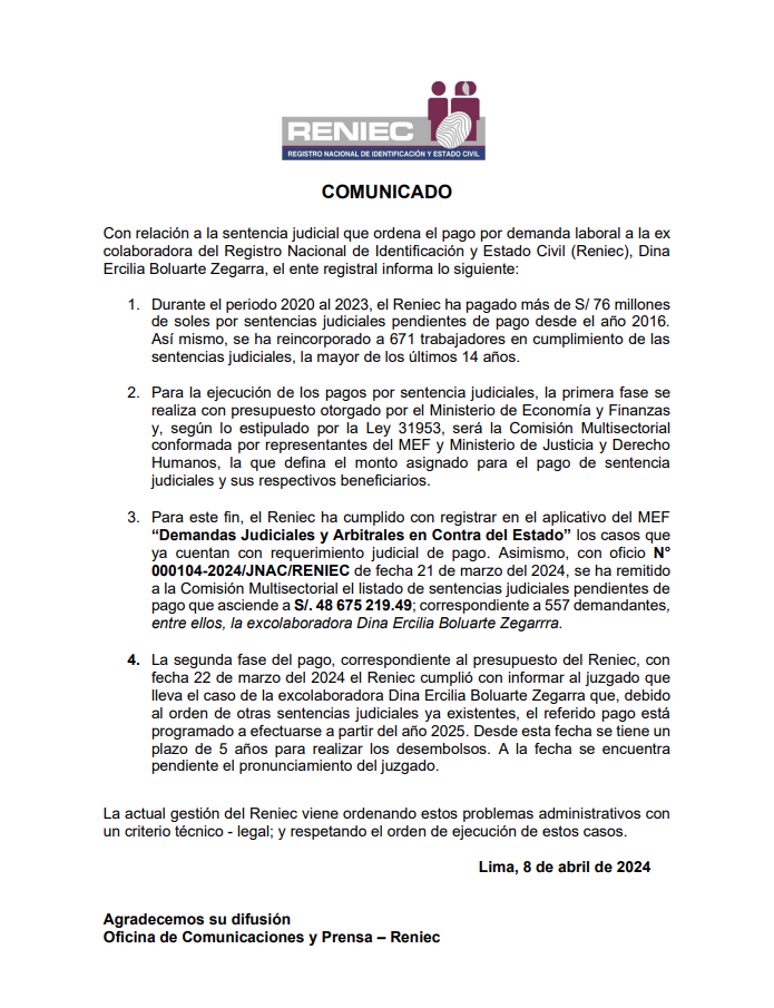 El Poder Judicial ordenó al Registro Nacional de Identificación y Estado Civil (Reniec) el pago de S/240.000 a favor de Dina Boluarte, esto tras la demanda laboral interpuesta durante el 2020 por la presidenta de la República. Este monto corresponde a conceptos de diferentes beneficios laborales.