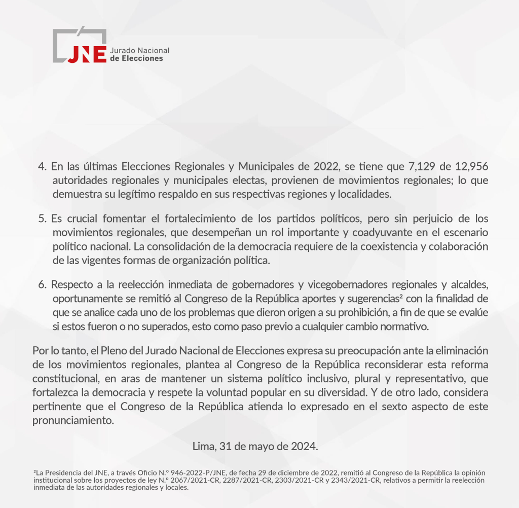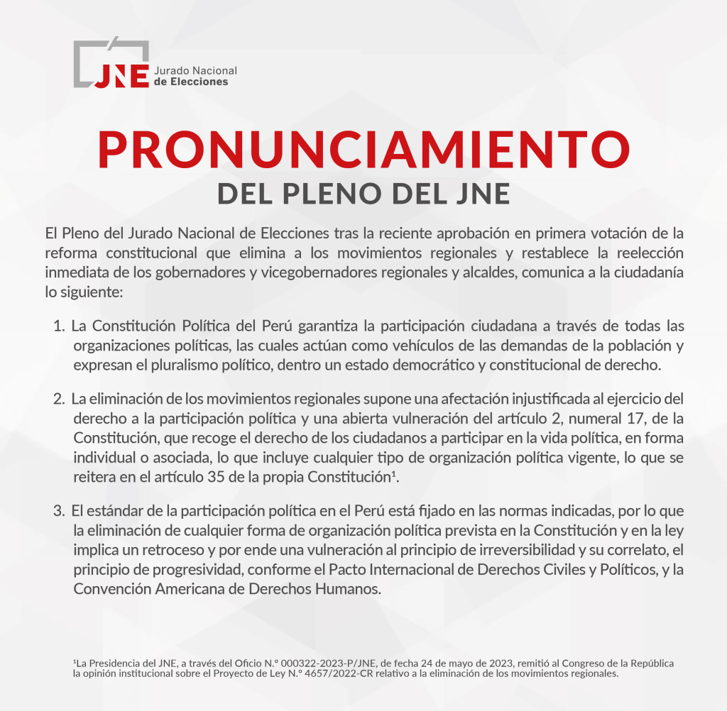 “La eliminación de los movimientos regionales supone una afectación injustificada al ejercicio del derecho a la participación política y una abierta vulneración del artículo 2, numeral 17, de la Constitución que recoge el derecho de los ciudadanos a participar en la vida política en forma individual o asociada”, se lee en el comunicado emitido en sus redes institucionales.